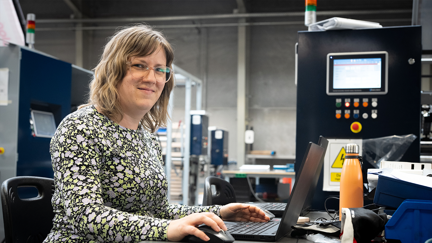 Sif er i 10 ugers praktik hos Roll-o-Matic, hvor hun både udfolder sig kreativt i arbejdet med brugerflader til industrielle maskiner og nørder med programmering af PLC’er og robotter.
